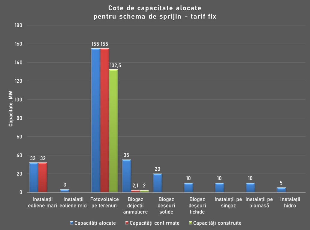 Astfel, în scopul încurajării potențialilor investitori au fost aplicate scheme de sprijin în conformitate cu Legea nr. 10/2016 privind promovarea utilizării energiei din surse regenerabile care presupun acordarea unor tarife/prețuri fixe pentru energia produsă din surse regenerabile. Statutul de producător eligibil este confirmat de către ANRE în limita cotelor de capacitate aprobate de Guvern pentru diferite tipuri de instalații de generare. Primele limite de capacitate, valabile până în anul 2020, au fost stabilite prin Hotărârea Guvernului nr. 689/2018, iar ulterior, prin Hotărârii Guvernului nr. 401/2021 s-au stabilit noi limite, valabile până 31 decembrie 2025.